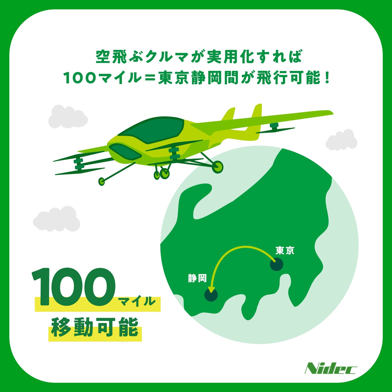 電動垂直離着陸機(eVTOL)、通称「空飛ぶクルマ」をご存じでしょうか?モータの進化によって、東京⇔静岡間の距離をも移動できる空飛ぶクルマが可能になると言われており、将来的には渋滞の緩和などの社会課題の解決も期待されています。eVTOLが普及すれば、離着陸の場所を確保しづらい都市部、小さな島、被災地支援にも空路での移動手段を提供することが可能になります。ニデックは世界第3位の航空機メーカー・エンブラエルと合弁会社を設立し、機体が空中で移動するためのモータ駆動に関する技術を提供しており、今後、東京⇔静岡間と同等の最長100マイル飛行可能なeVTOLが完成する