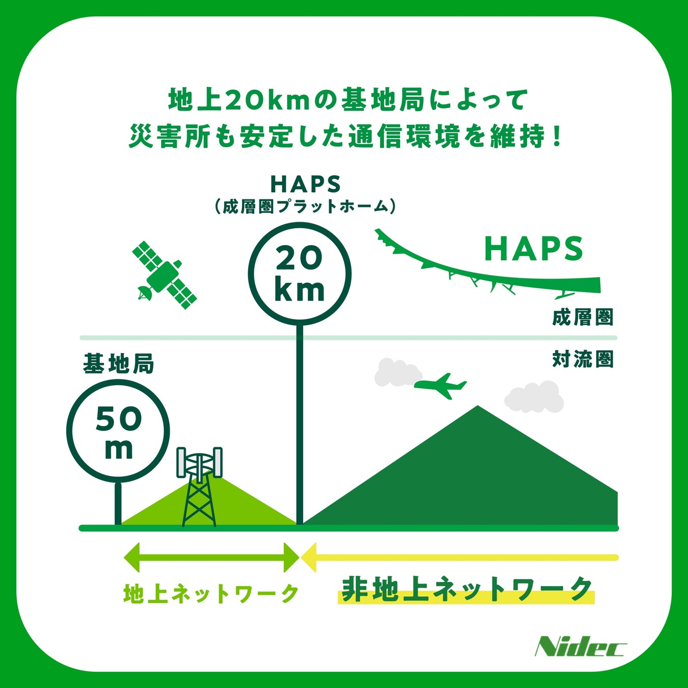 2024年1月に発生した能登半島地震では、地震の影響で多くの基地局が被災し、広範囲で通信が遮断されました。この通信遮断は、緊急情報伝達や被災者への支援活動に大きな支障をきたし、災害対応の遅れや混乱を招いたと言われています。このような災害時をはじめ、誰もがいつでもどこでも安定した通信環境につながることができる社会を目指し、成層圏を飛行する通信基地局の開発が進められています。 それが成層圏通信プラットフォーム(HAPS)です。この HAPSには軽量でエネルギー効率が高く、長時間の飛行を実現するモータの存在が欠かせません。ニデックは、ソーラー発電のみで長時間飛行を行うHAPS向けに、軽量・高効率・高信頼性のモータを開発し、成層圏の低圧環境においても安定した性能を発揮する高い放熱性を実現させました。