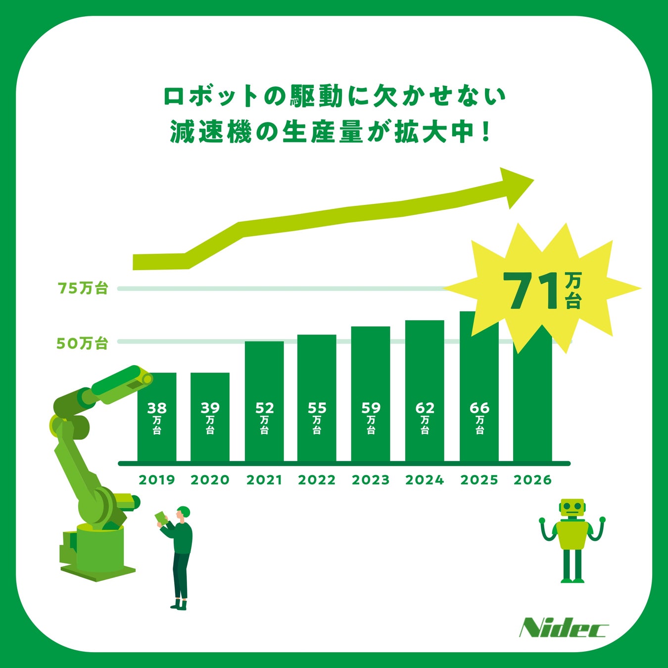 市場は、人手不足問題や自動化で競争力を高めたい企業の増加により、26年に71万台に拡大する見通しです(出典:国際ロボット連盟レポート)。そこでニデックは減速機とセンサ(トルク・温度・角度)を一体化した新製品を開発しました。減速機とセンサが一体化することで、協働ロボット(人と協力しながら働く人間協調型のロボット)の小型・軽量化、ロボットの衝突や過負荷検知、動作精度の向上、遠隔監視が可能となり、作業環境が改善されます。これにより、ロボットと円滑なコミュニケーションが可能になり、より快適で安全な労働環境につながるのです。