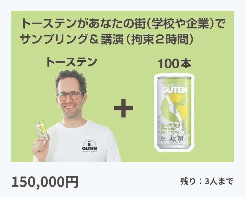 こちらのプランでご支援いただいた場合には、ご希望の場所まで訪れ、そこで「GUTEN」を配ったり、日本語での講演をいたします。そこでは商品開発に至る経緯だけでなく、日本への思いについても聞くことができるでしょう。