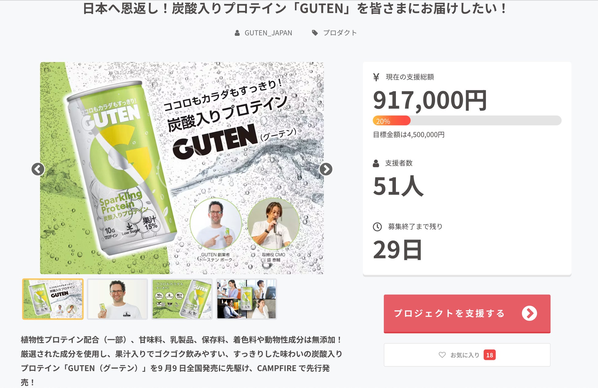 支援者の方にお礼としてお渡しするリターンの中には、発売を控えている「GUTEN」があります。そんな私たちの新商品である炭酸入りのプロテインドリンクには下記の6つの特徴があります。