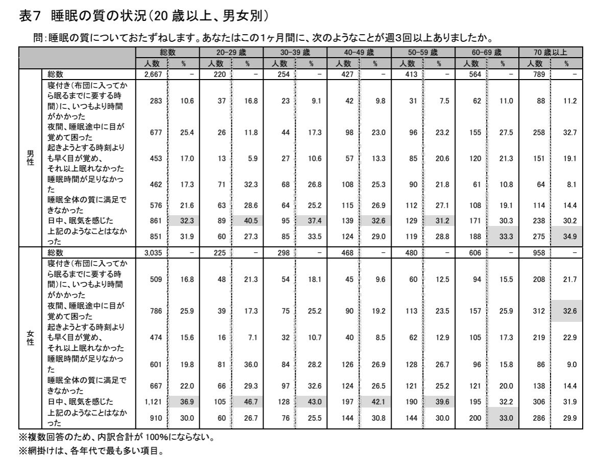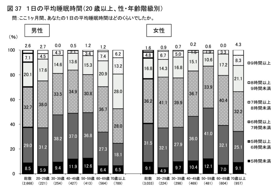 「睡眠負債大国」「世界で最も寝ていない国」と言われている日本。令和元年「国民健康・栄養調査」(厚生労働省)によると、男性の37.5%、女性の40.6%の睡眠時間は6時間未満です。加えて「睡眠全体の質に満足できなかった」人の割合は男性 21.6%、女性22.0%。「日中に眠気を感じた」人は男性32.3%、女性36.9%と、睡眠に課題を抱えている方が多いことがわかります。