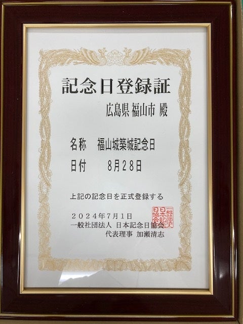 福山市は、福山藩初代藩主 水野勝成が福山城の完成を幕府に報告した日とされる8月28日を「福山城築城記念日」として登録しました(一般社団法人日本記念日協会認定)。築城した日を一般社団法人日本記念日協会に登録したのは、福山城が全国で初めてになります。