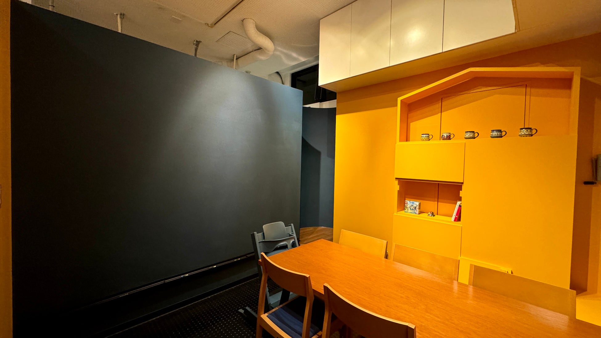 お店の奥にはキッズスペース付きのゆったりとした個室もあります。6名+お子様用椅子のご用意がございます。左の壁は黒板状になっており、一面にチョークでお絵描きしていただけます。