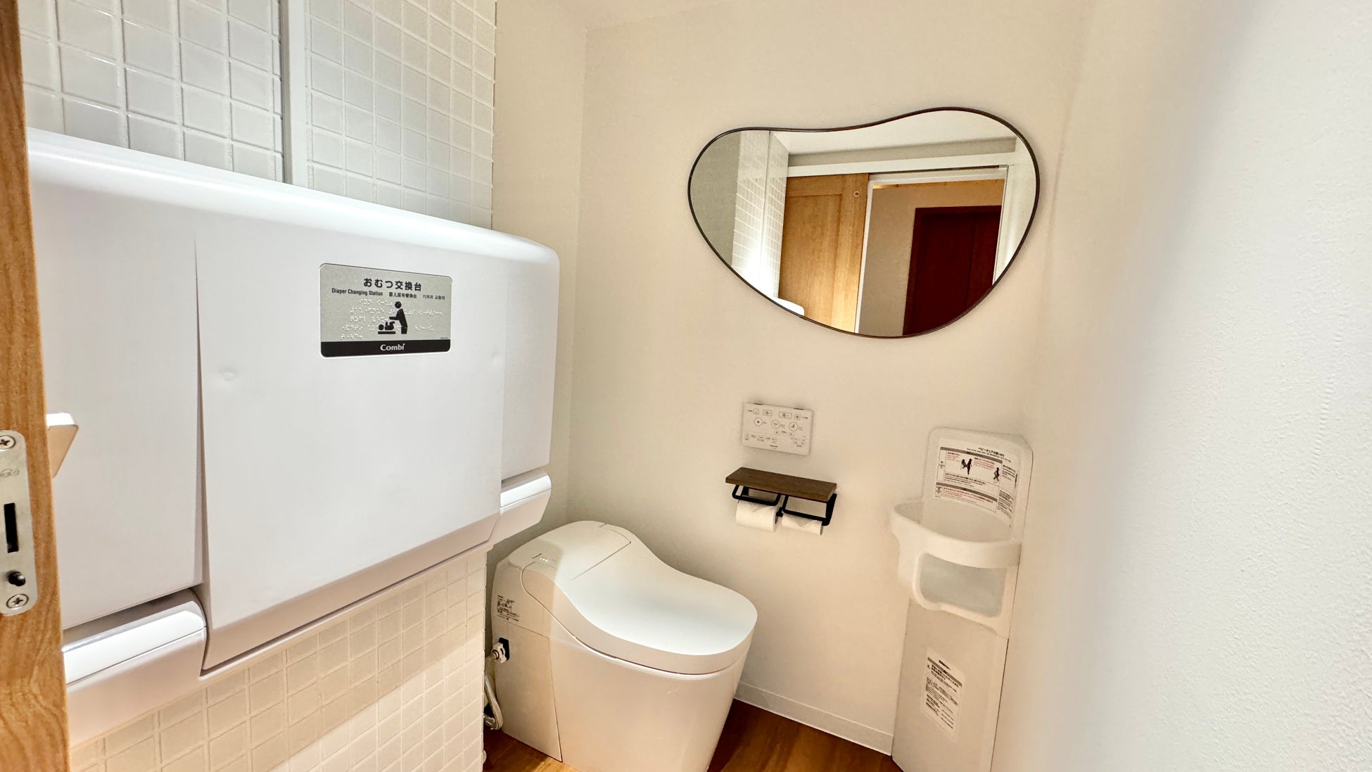 店内のお手洗いにはオムツ交換台やベビーキープも完備。赤ちゃんを抱っこして一緒にお手洗いに行き、オムツを交換することも可能です。キッズフレンドリーのお店ですので、お子様と一緒にごゆっくりお過ごしください。