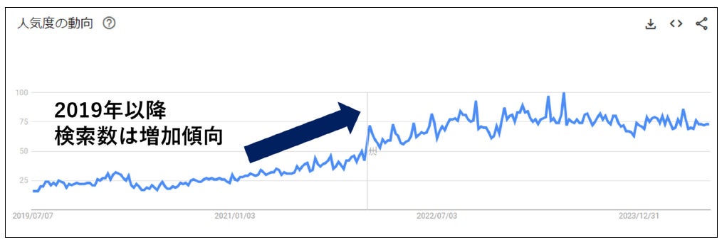 下記グラフ①はGoogle Trends にて「サウナ」の人気度動向をグラフ化したものです。2021年12月から現在まで高い数値を示し、その人気度が窺えます。