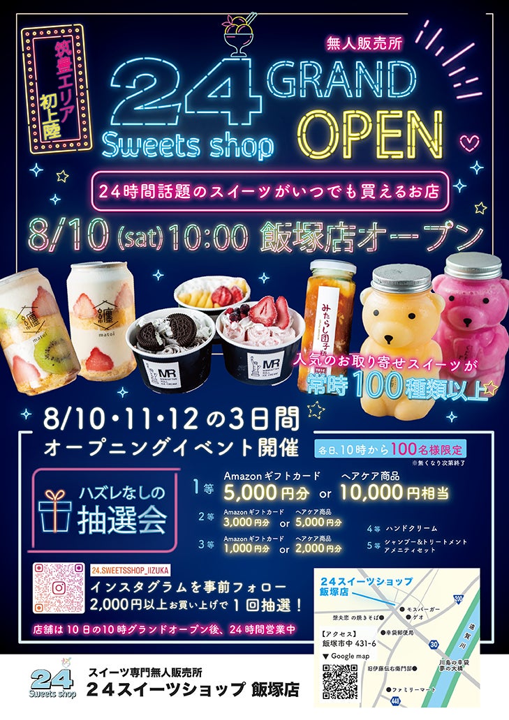 スイーツ専門無人販売所 「24スイーツショップ飯塚店」(住所:飯塚市中431-6)は、2024年8月10日(土)にグランドオープンします。新店舗は、24時間営業を予定し、常時100種類以上の冷凍スイーツを準備してお客様をお迎えいたします。