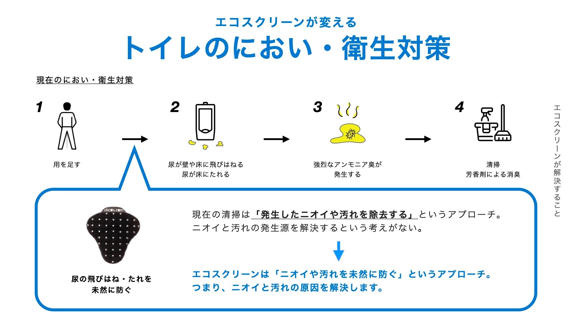 トイレが臭くなる原因は意外と正しく理解されていません。実は体から排泄された尿自体は無臭ですが、壁や床に飛びはねた尿が、時間の経過とともに空気中のバクテリアと反応を起こすことで、アンモニア臭を発生させています。つまり、トイレが臭くなる原因は「床や壁に飛びはねた尿」であり、「尿の飛びはねをなくすこと」はトイレのニオイ対策に劇的な効果が期待できます。また、トイレが汚れる最大の原因も「尿の飛びはね・たれ」であることは明らかです。エコスクリーンは「尿の飛びはね防止技術(シールド・ブリスルテクノロジー)」にて日本で特許を取得しており、ニオイと汚れの共通の原因に効果的な解決策を提供します。
