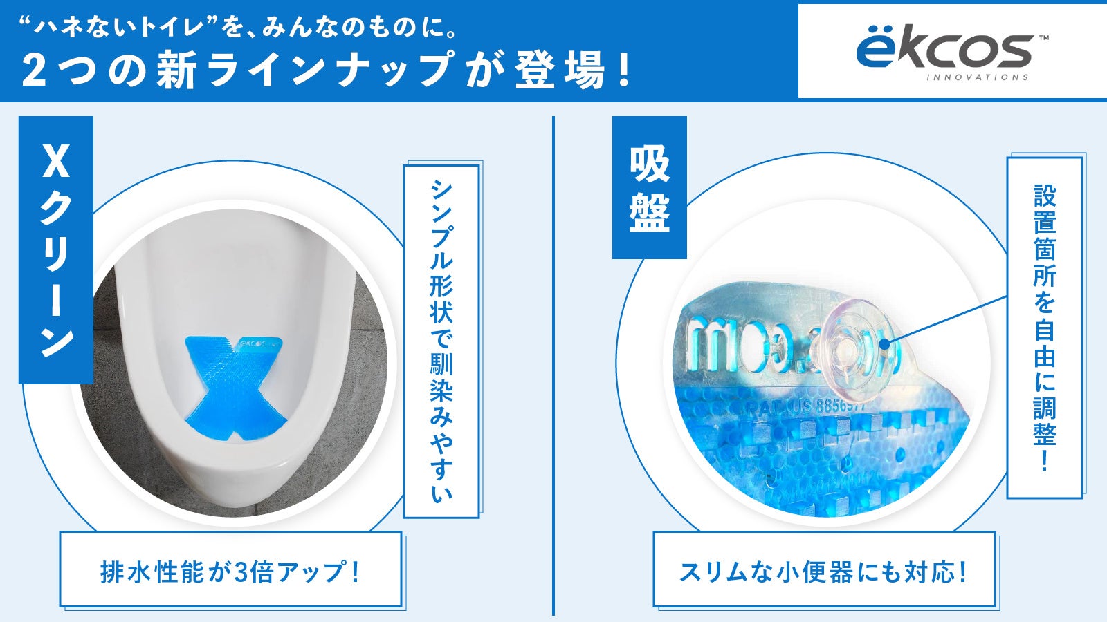 トイレの衛生環境を重視する多くのお客様に弊社製品をご利用いただく中で、「トイレの形状と合わない」「小便器の底に置くと狙いづらい」などのお声を頂くことがありました。そこでより多くの小便器に対応出来る形をしたXクリーンと設置位置の調整を可能にする吸盤の取り扱いを開始しました。