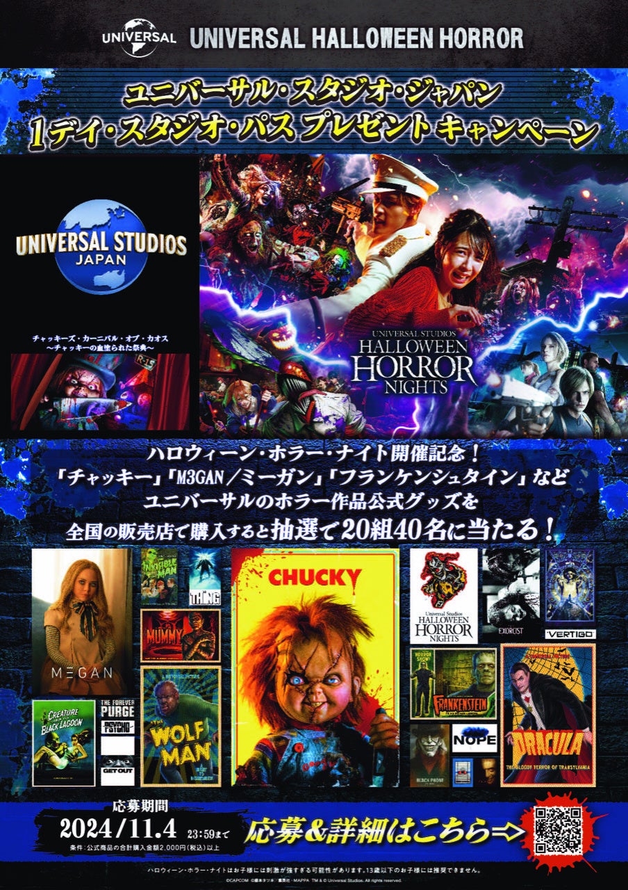 2024年9月6日(金)〜11月4日(月)にユニバーサル・スタジオ・ジャパンで開催される、超絶叫&超熱狂の「ハロウィーン・ホラー・ナイト」に合わせて、NBCユニバーサルではホラー作品の公式グッズを全国の販売店で購入すると、抽選で20組40名様に“ユニバーサル・スタジオ・ジャパン 1デイ・スタジオ・パス”が当たるキャンペーンを開催いたします。