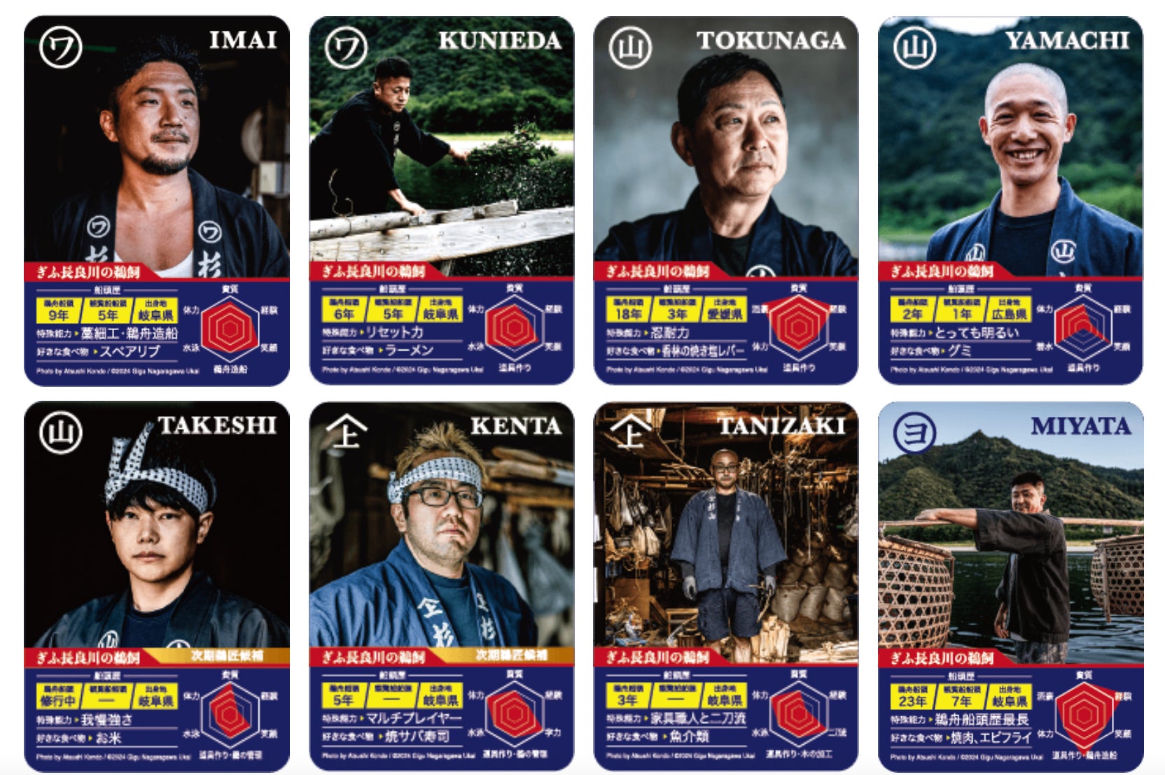 450年前と変わらぬ装束と漁法を守り続ける鵜匠と一方、アスリート並みの鍛え抜かれた肉体と日焼けした姿に竿と櫂を手に水上を走り抜ける船頭の勇姿は鵜匠同様に注目すべき存在といえる。そんな船頭たちに焦点を当てたのは東京からが岐阜へ移り住んだいわゆる移住組が「新しい地元」となる岐阜のためにできることを、と鵜飼の継承応援プロジェクトを立ち上げ企画制作を行なった。船頭たちの素顔を知るために、20時間以上にわたるインタビューを行い、それぞれの信条や性格、趣味や好きな食べ物に至るまでリサーチし、カードに盛り込んだ。カードのデザインを担当したクリエイティブ・ディレクターの南部美乃は「水の流れや水位、風や月まで読み取りながら鵜飼舟を操る姿には惚れ惚れします」と話す。