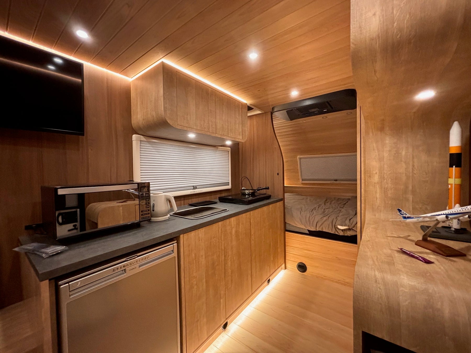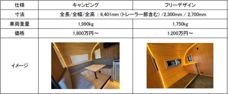 外装の周囲に楕円形に取り付く、航空機表面における空気抵抗を減少させるために装着する流線型のカバー (フェアリング) を模した部品は、航空機部品を手掛ける輸送機工業株式会社 (本社:愛知県半田市) が製造することで唯一無二のデザインを実現させました。車内は株式会社OND (本社:愛知県岡崎市) が担当し、ぜいたくに用いたヒノキと間接照明、丸みを帯びた家具により、ラグジュアリーでありつつも落ち着きとあたたかみを利用者にもたらす空間となりました。そして、これらの構造物を運ぶためのベーストレーラーは、SOREXブランドで製造販売を行う両備ホールディングス株式会社 (本社:岡山県岡山市) が設計・製造し、当社の思いを実現するための専用品として仕上げました。