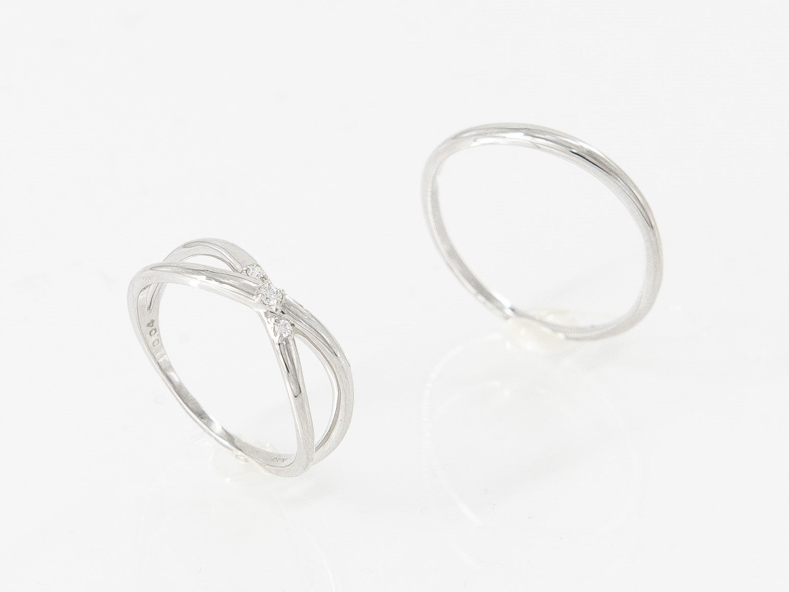 レディスリングのデザインは二人の人生が重なったことを表しています。その瞬間に輝くダイヤモンドを配置しました。