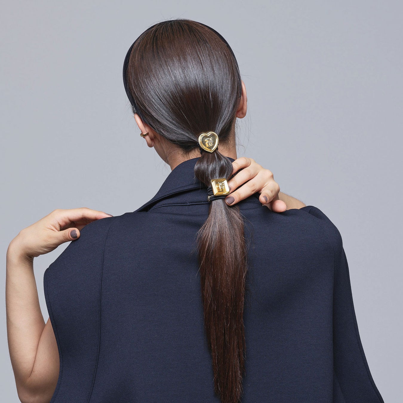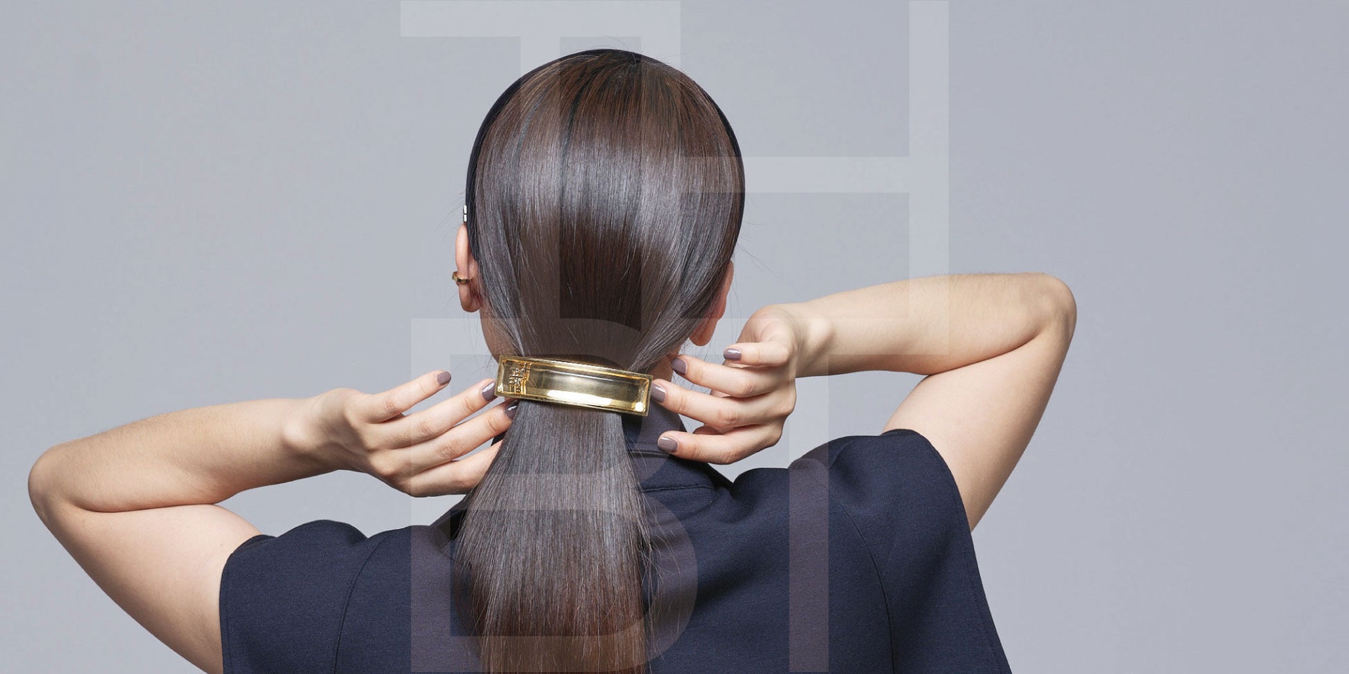 メタルのオーナメントにブロックのように飛び出したアクリルとTHBTエンブレムが立体的に設計されたモードでクール、エッジの効いたデザイン。カラーはHEM(ヘマタイト/グレー)、GLD(ゴールド)の2色。ブレスレットとして着けておけばいつでもさっとクールなまとめ髪ができるマルチユースなアイテムです。