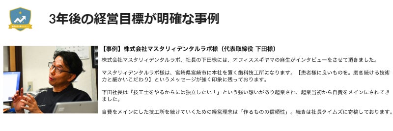 その中でも、特に「3年後の経営目標がある」という基準に関しては、『社長タイムズ』というインタビュー記事を通じて、企業の経営者のビジョンを深く掘り下げています。『社長タイムズ』は、経営者の過去、現在、未来、そして従業員や求職者への想いを詳しくインタビューし、記事としてまとめるメディアです。