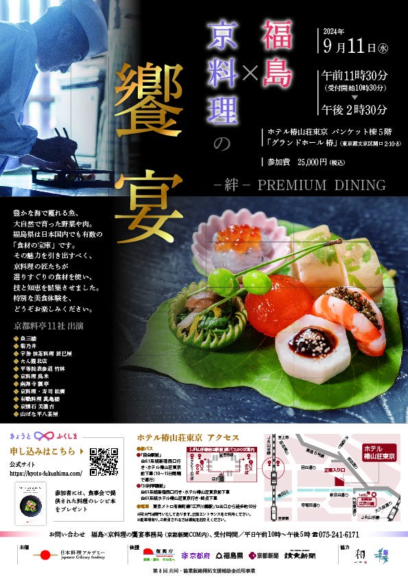 特定非営利活動法人「日本料理アカデミー」(所在地:京都市)は、福島県産食材を使った懐石料理を味わう「福島×京料理の饗宴 -絆- PREMIUM DINING」(後援:復興庁、京都府、福島県、京都新聞、読売新聞社)を9月11日(水)午前11:30から、ホテル椿山荘東京で開催します。