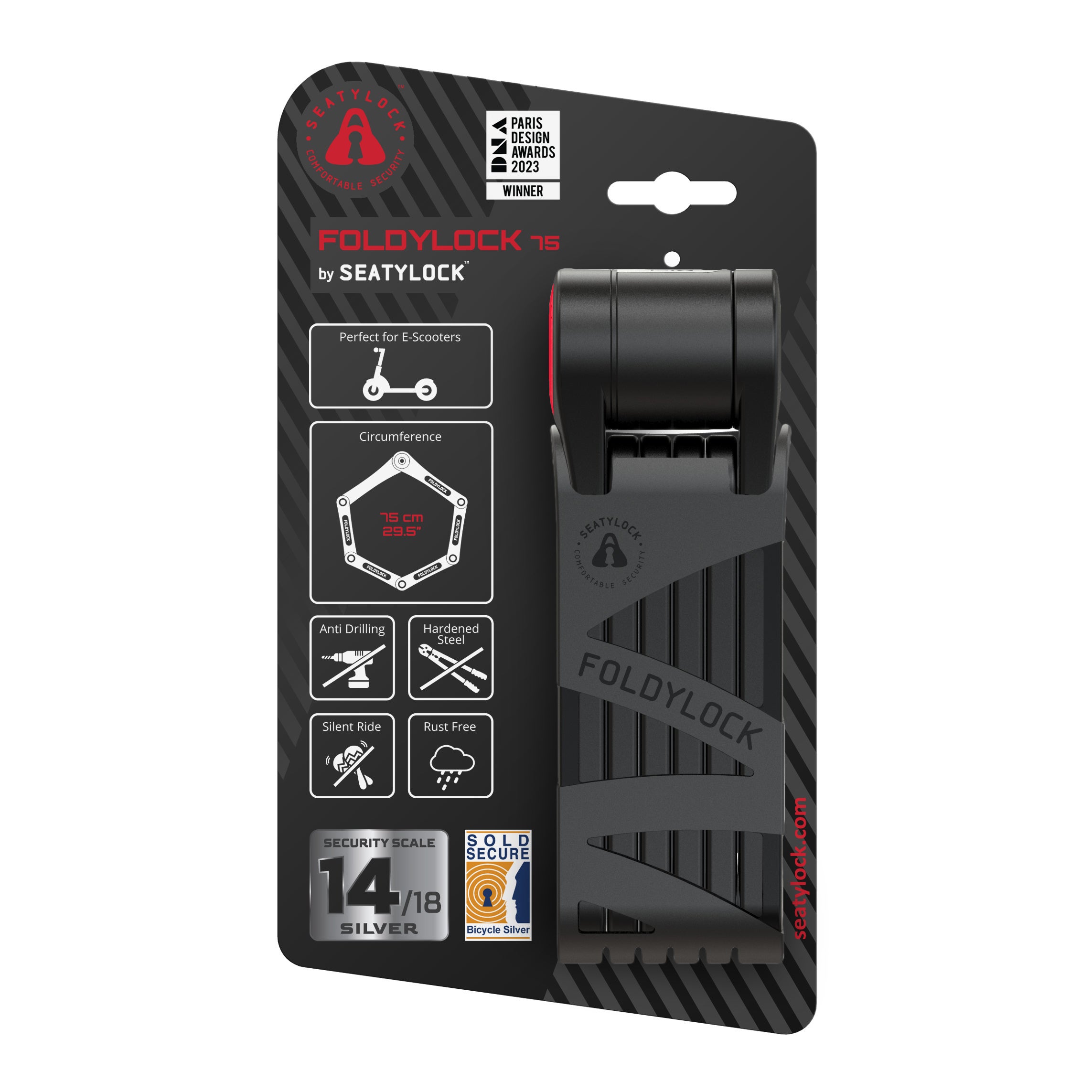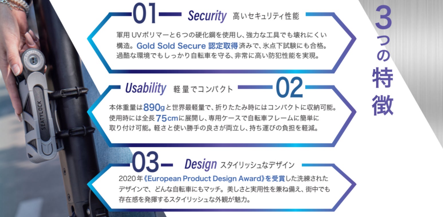FOLDYLOCKは、イギリスの破壊検査機関Sold SecureでGold認定を受けた防犯力と、890gの軽量設計、幅広いデザイン性を備えています。米国Amazonで高評価を獲得し、European Product Design Award 2020も受賞したこの製品は、自転車愛好家にとって欠かせないアイテムです。
