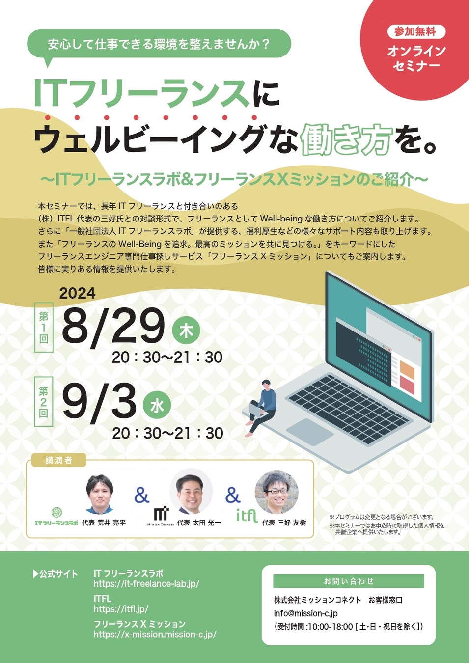 ITフリーランスラボの設立を記念して、我々がサポートできることの詳しいご紹介/ご説明や、参加者のみなさんが抱えているお悩みに役立つ情報を提供することを目的に、オンラインセミナーを開催します!
