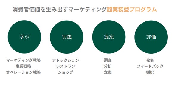 今回の産学連携では、高度観光人材の育成を目的とした長期のインターンシップを予定しています。インターン生は、消費者価値を生み出すスキルを身につけるため、あらゆる場面で消費価値を生み出すことが求められるテーマパークで、マーケティングノウハウをベースとした実践および改善提案をします。また、長期インターンシップを実現するため、パークに近接する複合型の研修滞在施設を設立し、多方面でインターン生を支援します。