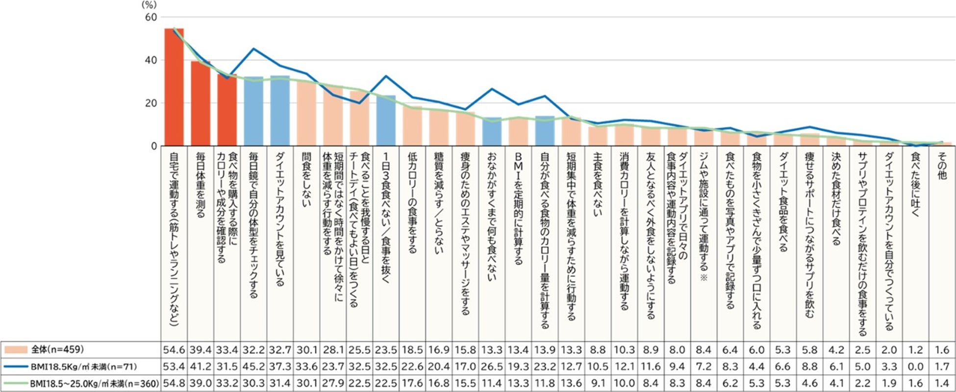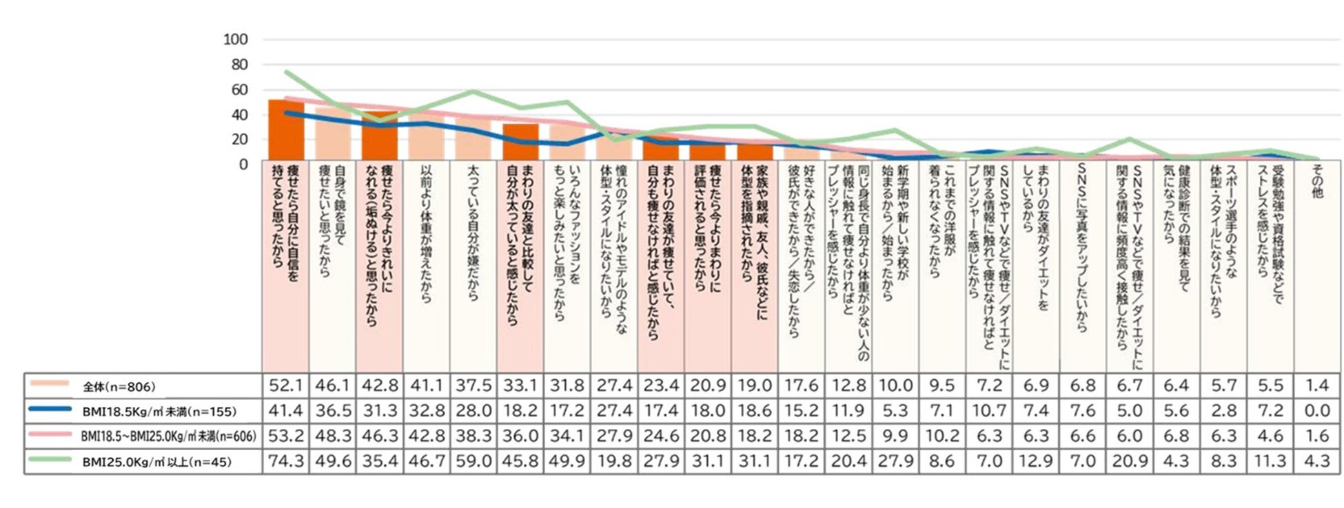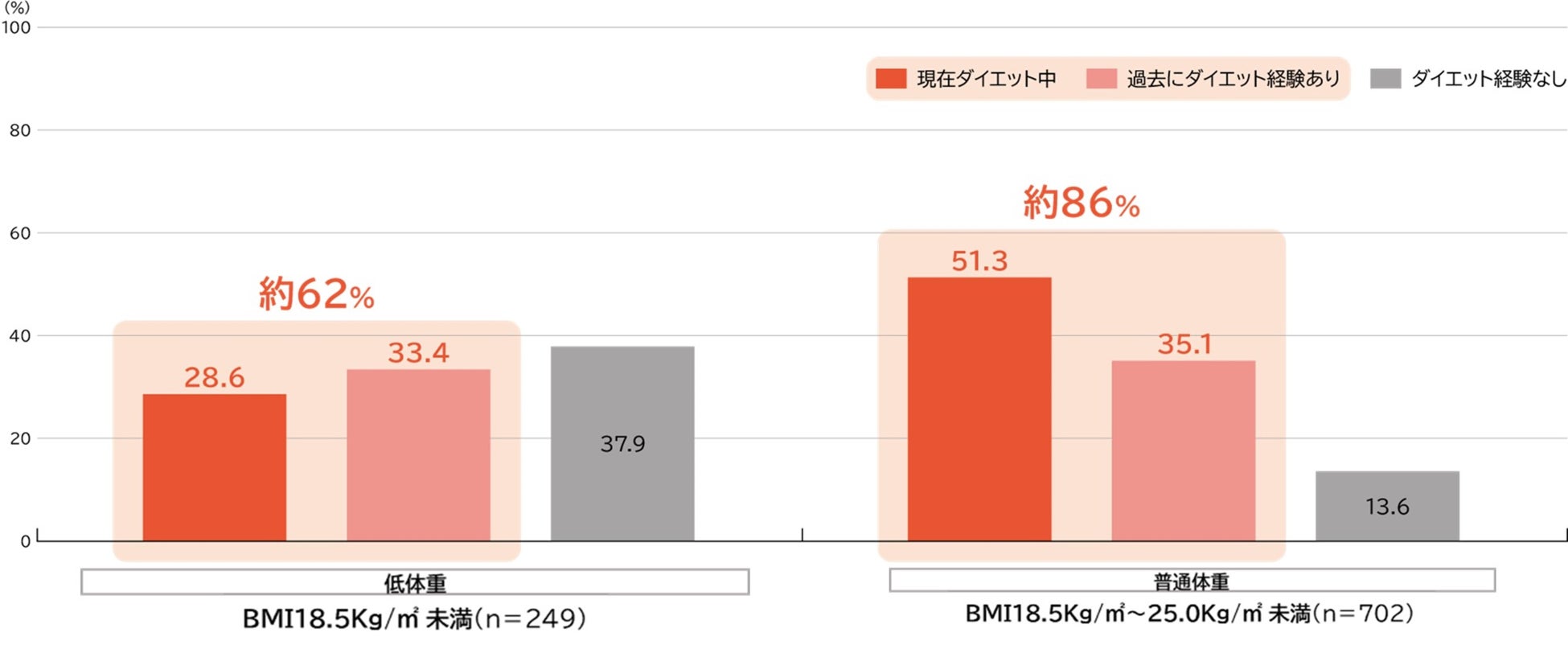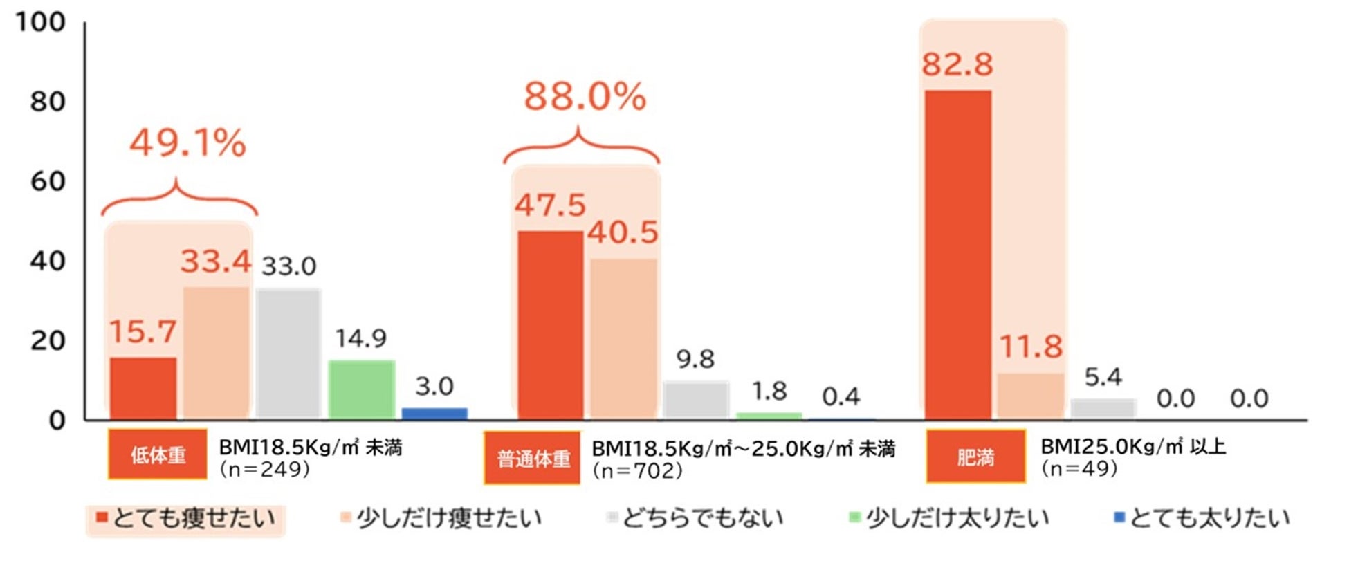 低体重、普通体重のいずれも半数以上がダイエット経験あり。過剰なダイエットの影に潜む「痩せることで自信が持てる」という価値観。