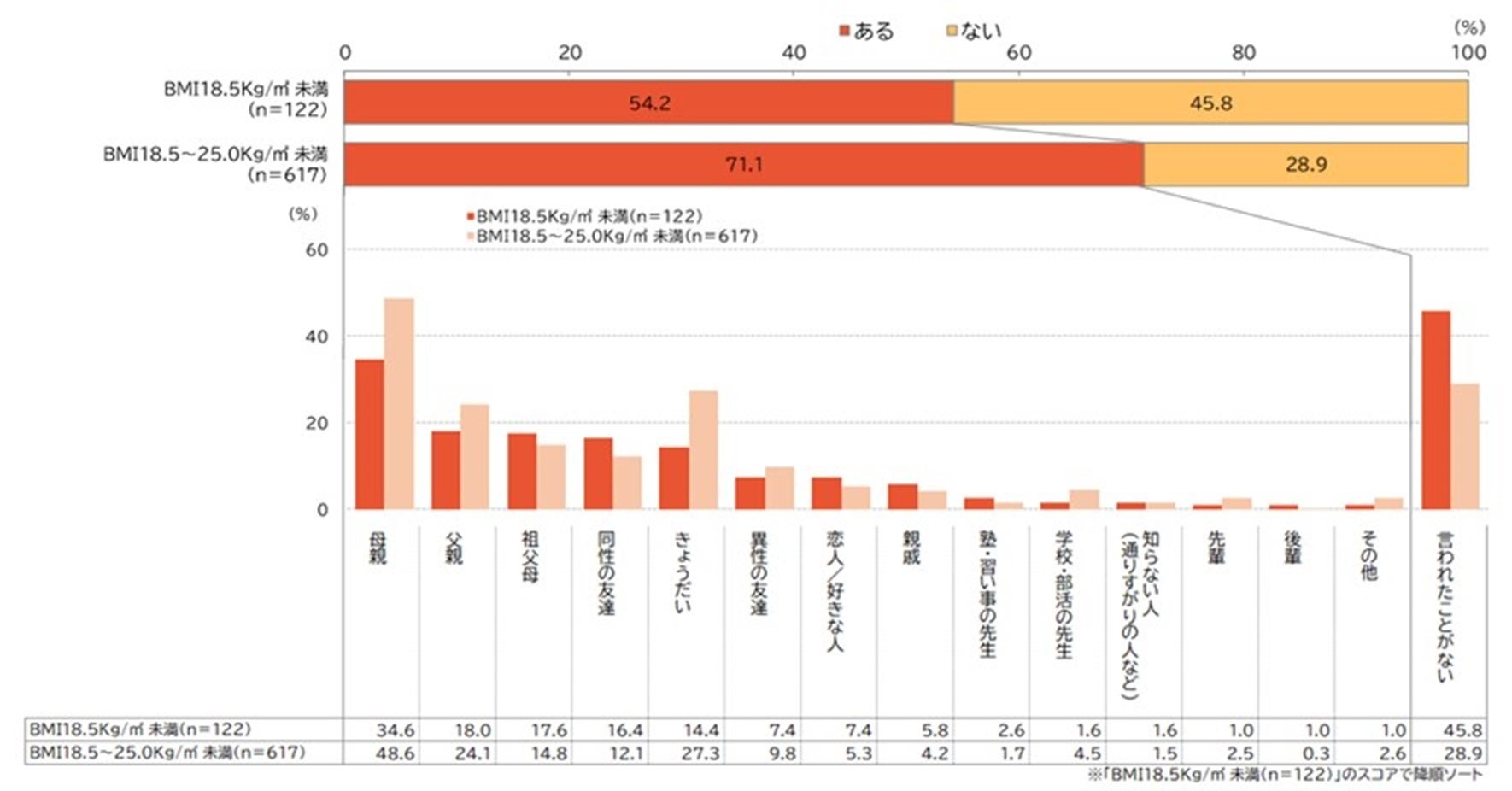 身近な家族からの何気ない言葉が痩せたい欲求につながる可能性も。体型についてネガティブな発言を受けた経験は、低体重、普通体重ともに半数超え。