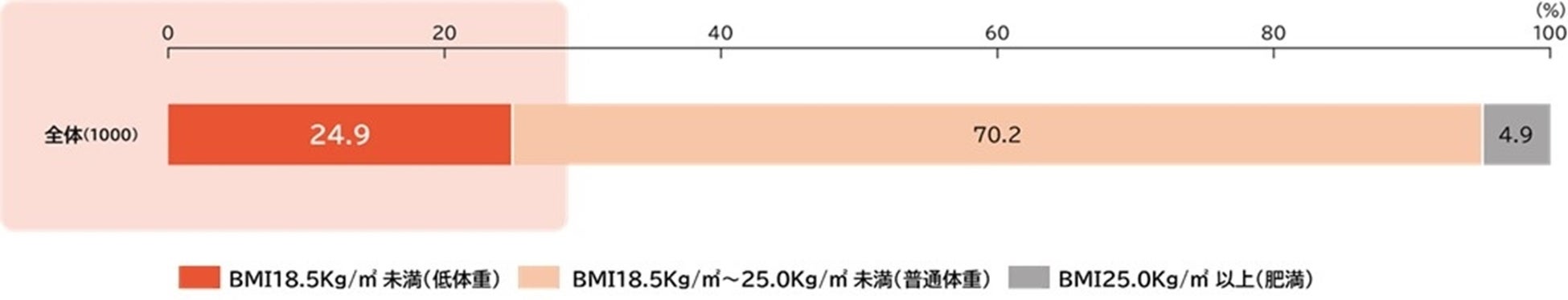 全国の16歳~23歳の若年女性1000名の身長および体重からBMI数値を算出したところ、BMI値が18.5 Kg/㎡未満(以下、低体重)は24.9%、BMI18.5-25.0Kg/㎡未満(以下、普通体重)が70.2%、BMI25Kg/㎡以上の「肥満」に該当する人が4.9%であることがわかりました。普通体重の人が過半数を占めているものの、4人に1人がSNS上で話題のシンデレラ体重*2に近しい「低体重」に該当しました(図1)。