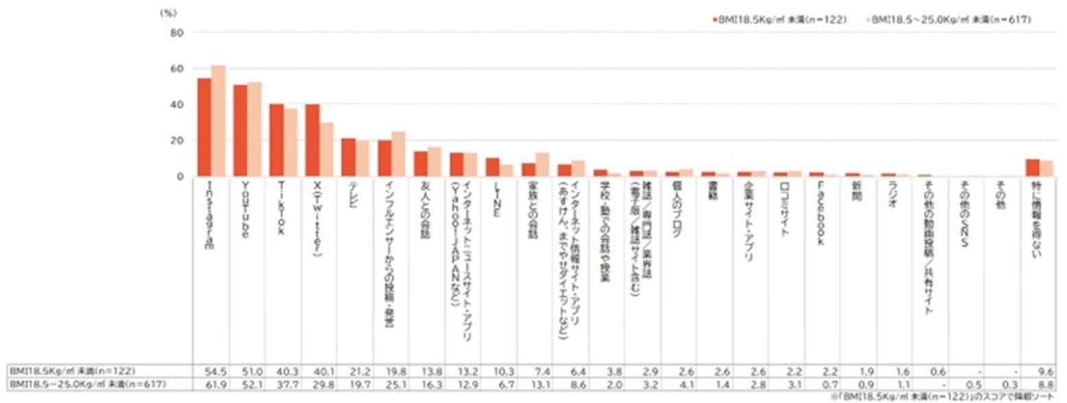 7. 痩せたい欲求がある若年女性のダイエットの情報源は、低体重、普通体重ともにInstagramがトップで、次いでYouTube、TikTokと続く。BMI区分に関わらず、ビジュアル発信をメインとした媒体が上位3位を占めていることから、SNS上のコンテンツが若年女性の目指す体型の具体的なイメージに強く影響を与えている可能性が示唆された。(図⑧)。