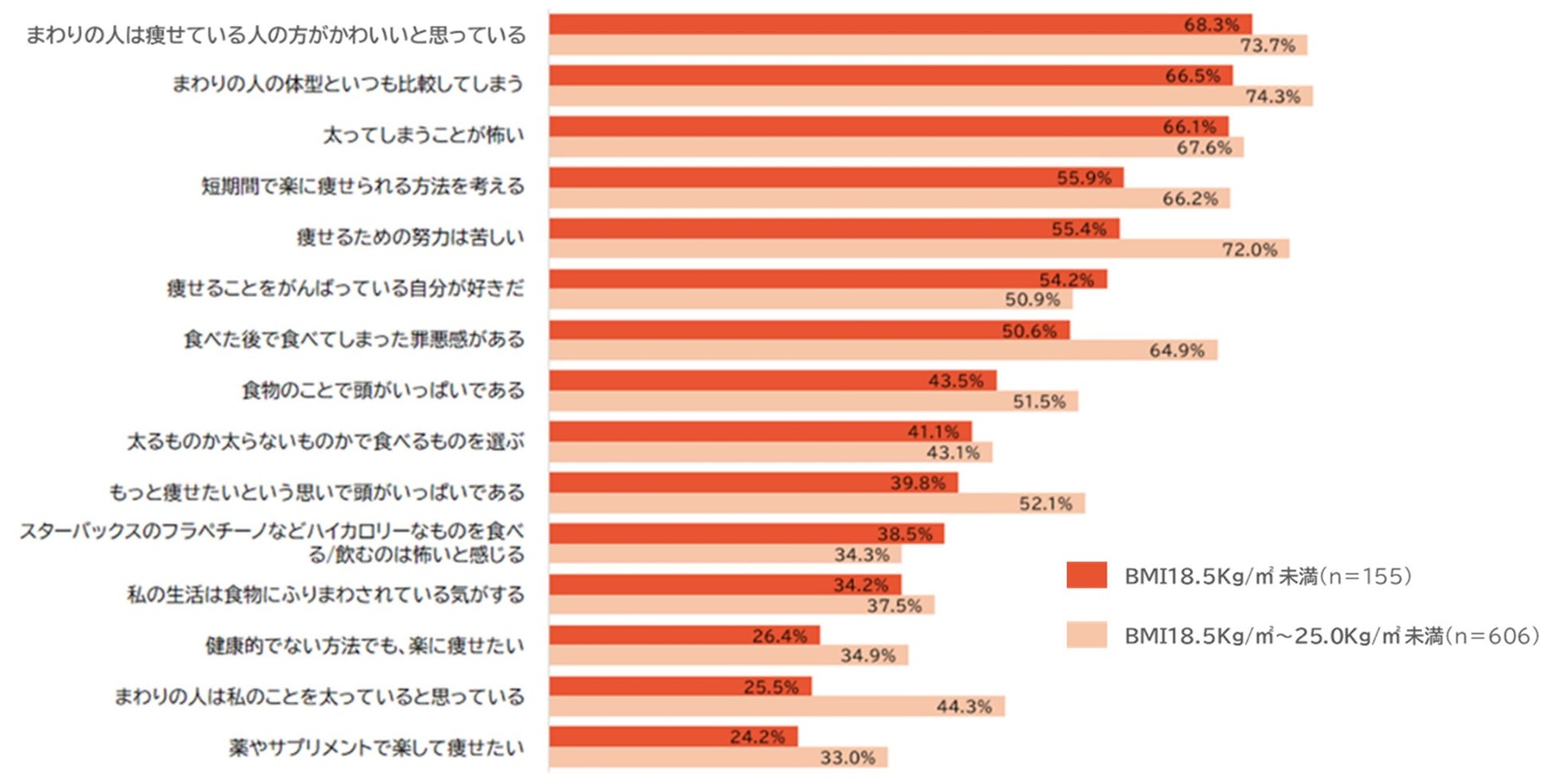 ダイエット経験者の意識を見ると、低体重(155名)、普通体重(606名)のどちらも「まわりの人は痩せている人の方がかわいいと思っている」「まわりの人の体型といつも比較してしまう」が上位2位を占めており、周囲の評価や周囲との比較を気にする傾向があることが判明しました。また、低体重の半数以上(55.4%)、普通体重の7割以上(72.0%)が「痩せるための努力は苦しい」と思っている一方で、低体重、普通体重いずれの人も6割以上の人が「太ってしまうことが怖い(低体重:66.1%、普通体重:67.6%)」と感じていることも顕在化しています。