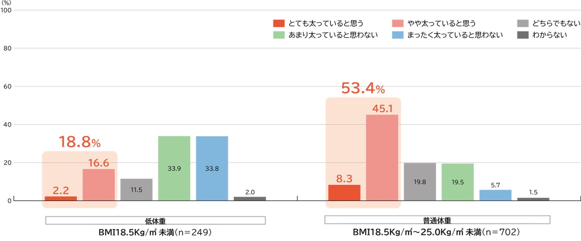 本調査では、特に低体重と普通体重に着目して検討した結果、普通体重の約半数(53.4%)が自分を「太っている(とても太っていると思う、やや太っていると思う計)」と認識していることがわかりました。この認識は、低体重女性の約2割(18.8%)にも見られます。また、痩せたいという欲求についても、低体重の約16%、普通体重の約半数が「とても痩せたい」と感じていることが判明しました。