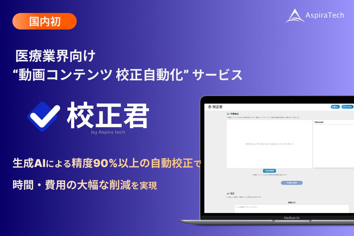 株式会社アスピレテック(本社:東京都千代田区、代表取締役:周 涵)は、医療業界向けに動画コンテンツの校正業務をAIで自動化する国内初※のSaaSサービス「校正君」を正式にリリースいたします。このサービスは、広告代理店、製薬企業、制作会社のディレクターやプロデューサー、動画編集者、校正担当者に向け、字幕とスライドの差分検出をAIが自動で行うことで、校正業務の負担を大幅に軽減します。