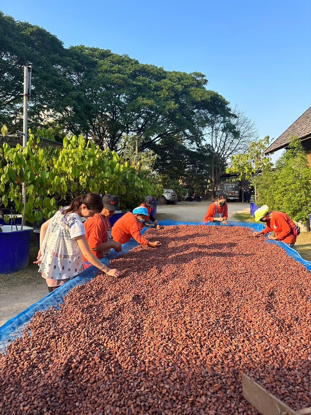 原料となるカカオ豆は「作り手の顔が見えるカカオ豆を使いたい」という想いを込めて、栽培環境や品質にこだわったタイ・ランパン産のカカオ豆を厳選しました。平井自らが現地へ出向き、パートナー工場と連携してカカオの収穫から発酵、乾燥までの工程を視察。直接買い付けたカカオ豆を使い、東京・奥沢の工場で一つひとつ手作業で丁寧に加工しています。フレッシュな酸味とすっきりとした味わいで、くどさがなく、さっぱりとした風味が楽しめます。