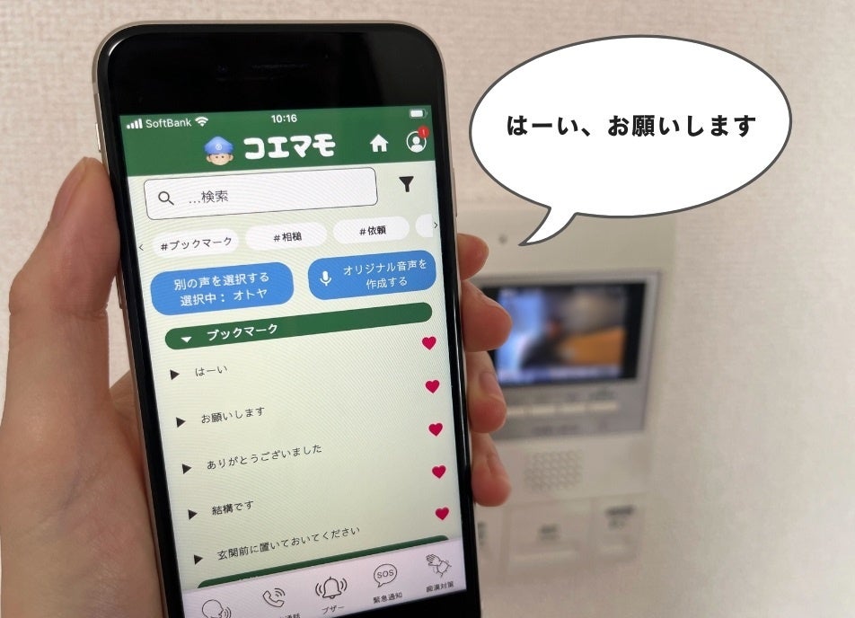 インターホン対応の際、ワンタッチで自然な男性音声が代わりに応答します。音声は計198個(台詞66種×声の出演者3名)を用意し、荷物受け取り時や迷惑電話の対応に最適です。例として、「ありがとうございます」「お願いします」「どちら様ですか」「玄関の前に置いておいてください」などの台詞があります。