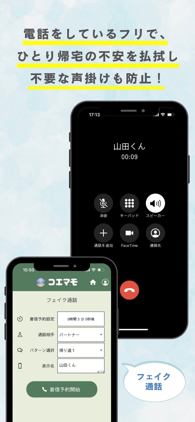 リアルな通話音声が流れるため、それに合わせて相槌をうつことで、本物の電話をしているように見せかけます。ひとりでの帰宅時や騒がしい場所を歩く際の不安を軽減し、危険を感じた際の抑止力として効果的です。また、時間指定で着信音を鳴らし、電話がかかってきたように演出することも可能です。
