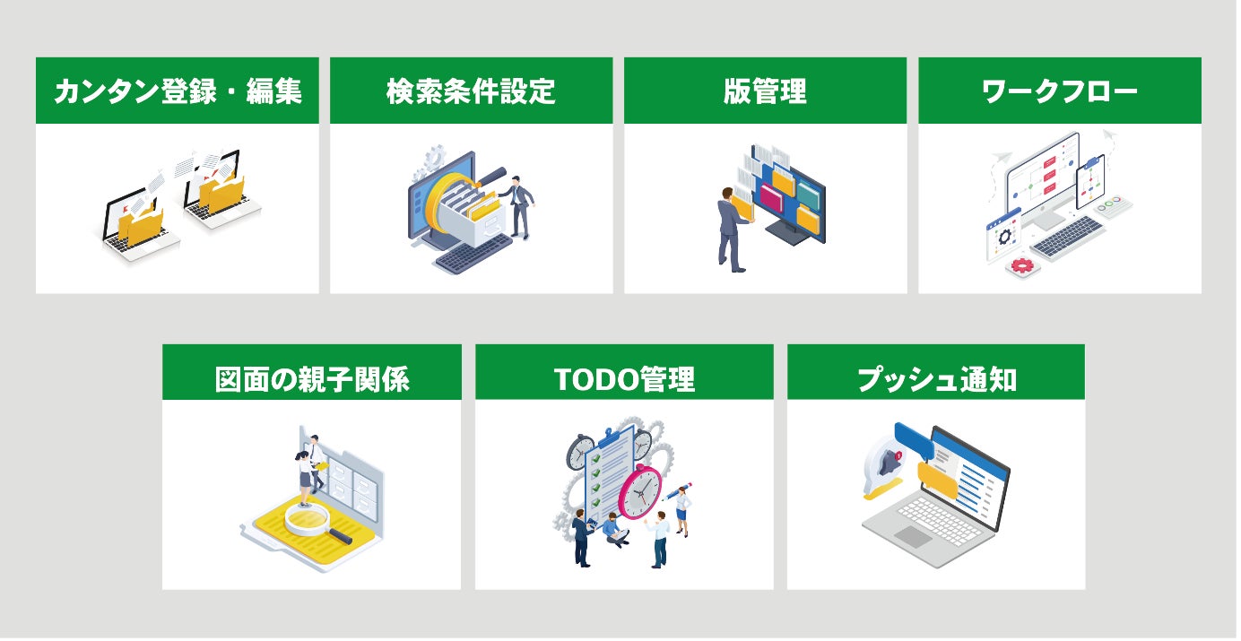 「NAZCA5 EDM」は、図面管理システムとして必要な基本機能を7つ厳選して、搭載しています。