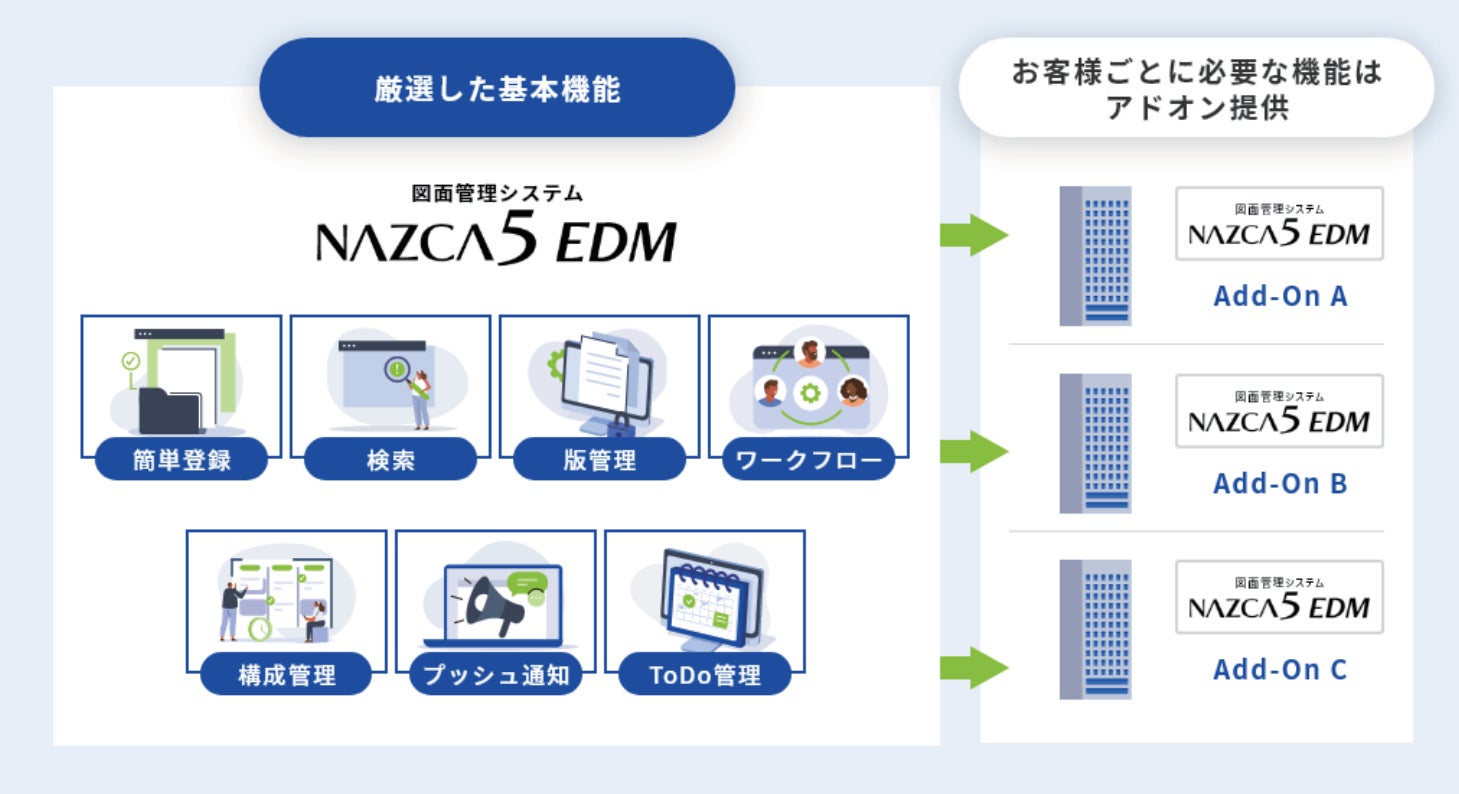 さらに、「NAZCA5 EDM」は、オプションで必要な機能を追加できる設計により、各企業のニーズに応じた柔軟なカスタマイズが可能です。企業ごとの業務プロセスに合ったシステムを提供できるため、導入効果を最大限、引き出すことが可能です。