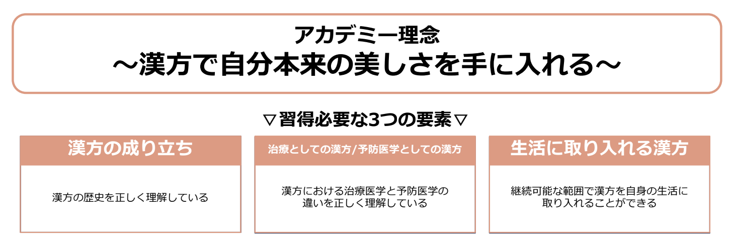 一般的に漢方と聞くと漢方薬を思い浮かべる方が多く、漢方が持つ様々な効果・効能、活かし方を理解できてない方が多くいます。中国最古の医学書と呼ばれる「⻩帝内経」には皮膚トラブルや老化に対する効能が書かれているなど、当時の医学では外観の美しさは身体の健康と捉えることから美容との結び付きが非常に強い学問になっています。その歴史は2200年以上とも言われ、王宮に住まう皇帝や皇后のために研究されてきたものです。そんな古くから伝わる老化の予防医学である漢方を正しく理解、活用いただきたく本アカデミーの開講に至りました。