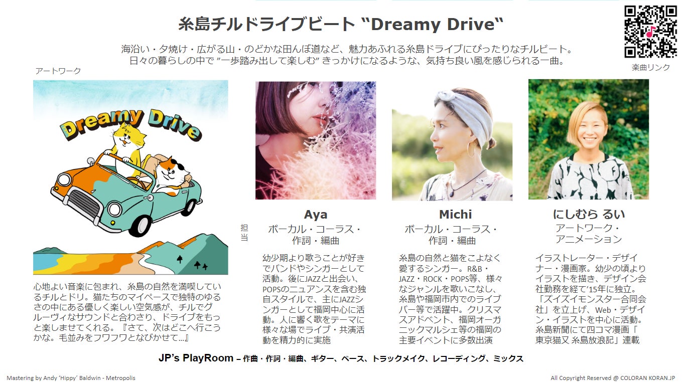 本プロジェクト第一弾として2024年9月1日にデジタルリリースされる楽曲「Dreamy Drive (feat. Aya & Michi)」は、海沿い・夕焼け・広がる山・のどかな田んぼ道など、魅力あふれる糸島ドライブにぴったりなチルビートです。日々の暮らしの中で ”一歩踏み出して楽しむ” きっかけになるような、気持ち良い風を感じられる一曲に仕上がっています。