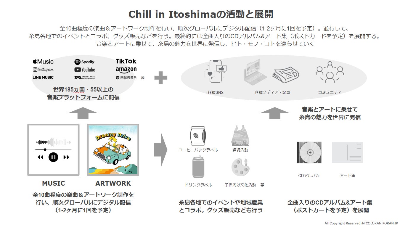 また、糸島内のローカルイベントでのライブパフォーマンスや、糸島の魅力を伝えるメディアとのタイアップ、地域の商品とのコラボレーショングッズの制作・展開を通じて、糸島の地域コミュニティを盛り上げると共に、糸島に関心がある方々が糸島を知る”きっかけ”作りを目指します。音楽とアートを通して、糸島のリラックスした「チル」な空気感を皆様の日常に届け、糸島にいてもいなくても、心地よい「チル」なひとときを感じられるようにしていきます。
