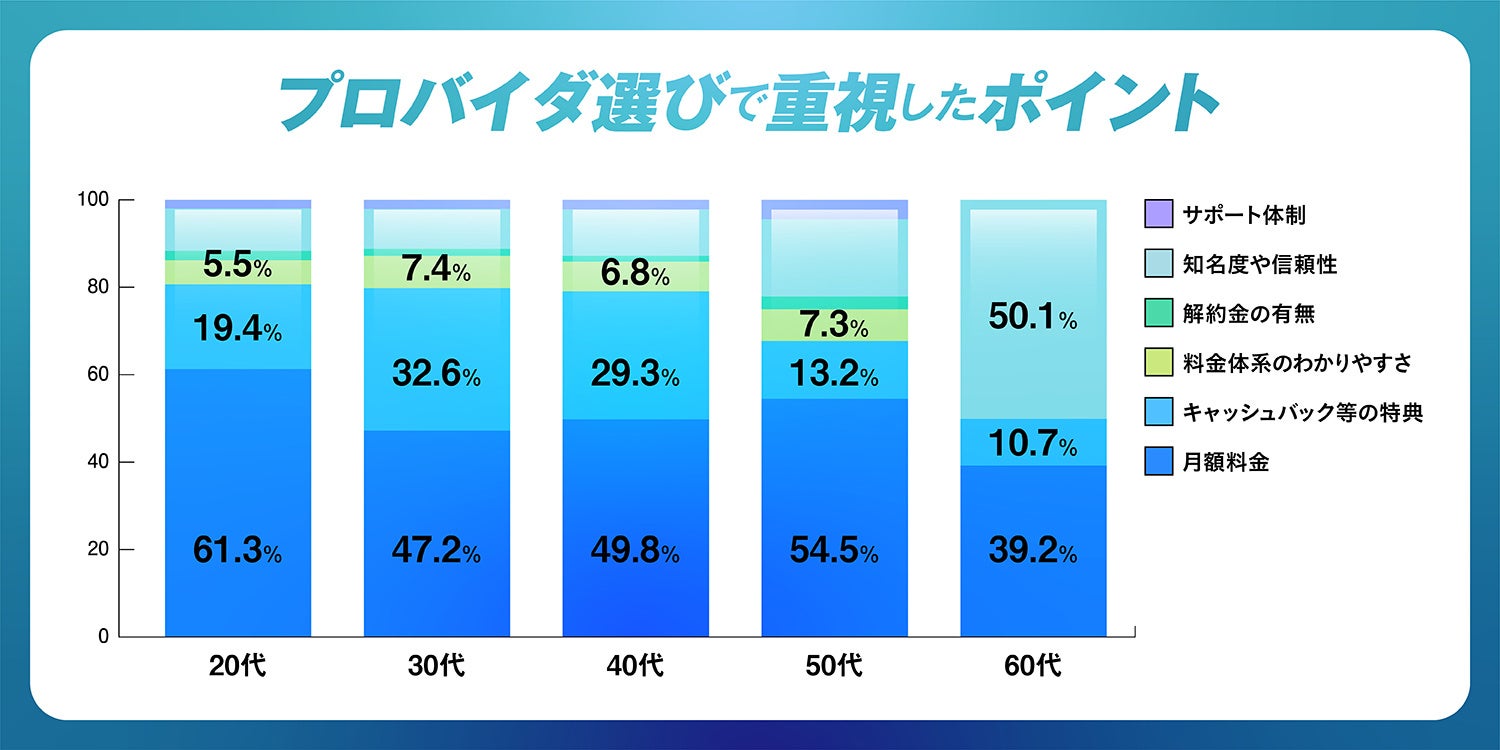 そうした中、プロバイダ選びにおいて、20代のユーザーは「月額料金」を、30代〜40代は「キャッシュバックなどの特典」を重要視していることがわかりました。