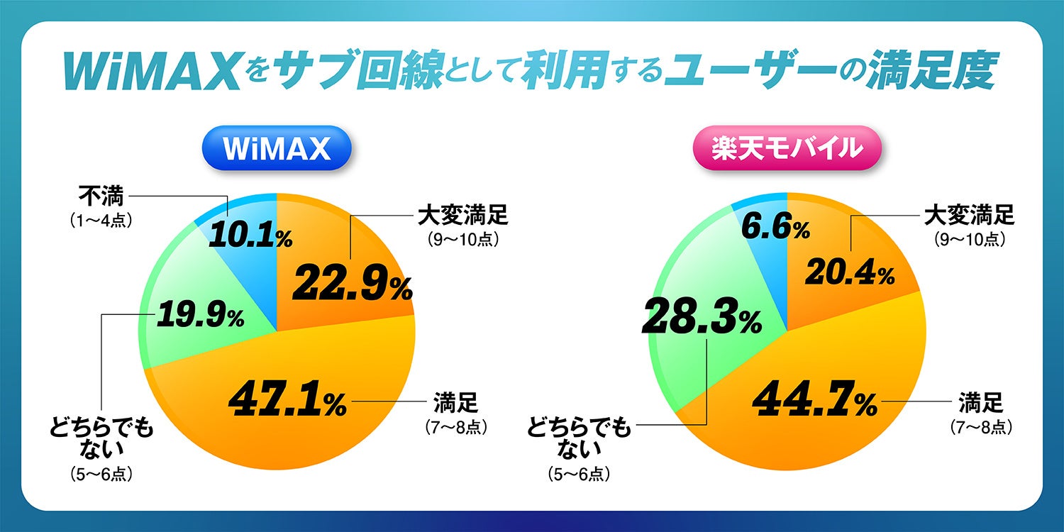 サブ回線利用者の満足度を「WiMAX」と「楽天モバイル」で比べてみたところ、どちらも約7割のユーザーが満足していることがわかりました。