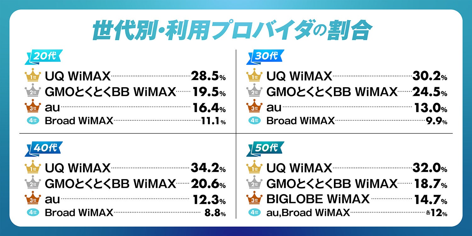 魅力的なキャッシュバックを実施することで人気の『GMOとくとくBB WiMAX』を抑え、各年代で『UQ WiMAX』の利用者が最も多いという結果になりました。