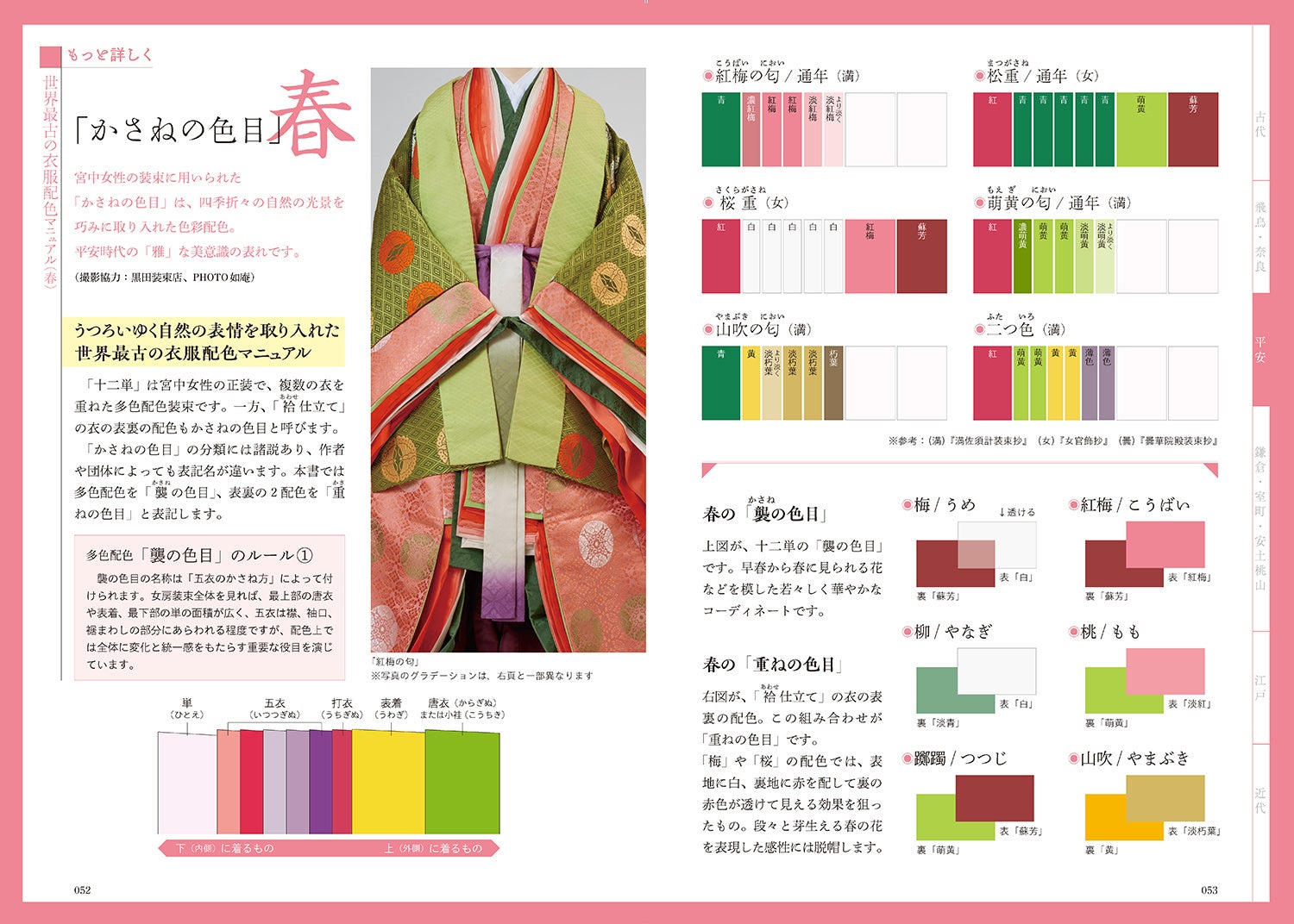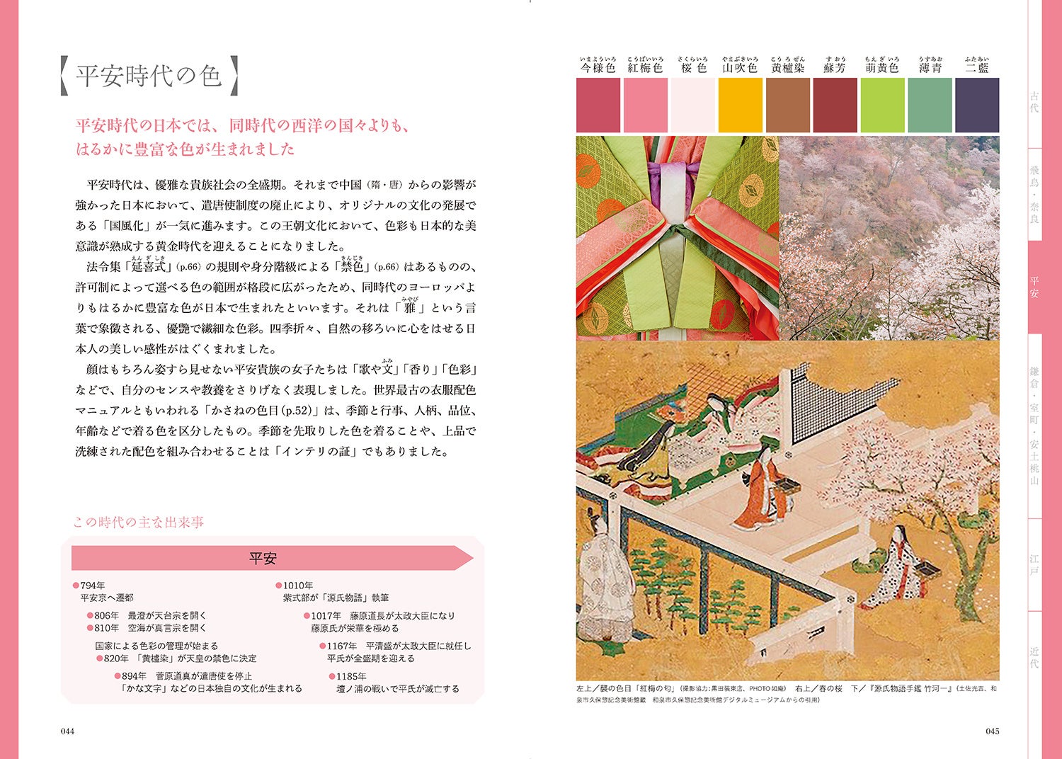 優雅な貴族社会の全盛期。「国風化」で日本的な美意識が熟成、優艶で繊細な色彩や、自然の移ろいに心をはせる日本人の美しい感性が育んだ色を紹介。平安貴族女性たちの衣服配色マニュアルも図解しながら丁寧に解説。