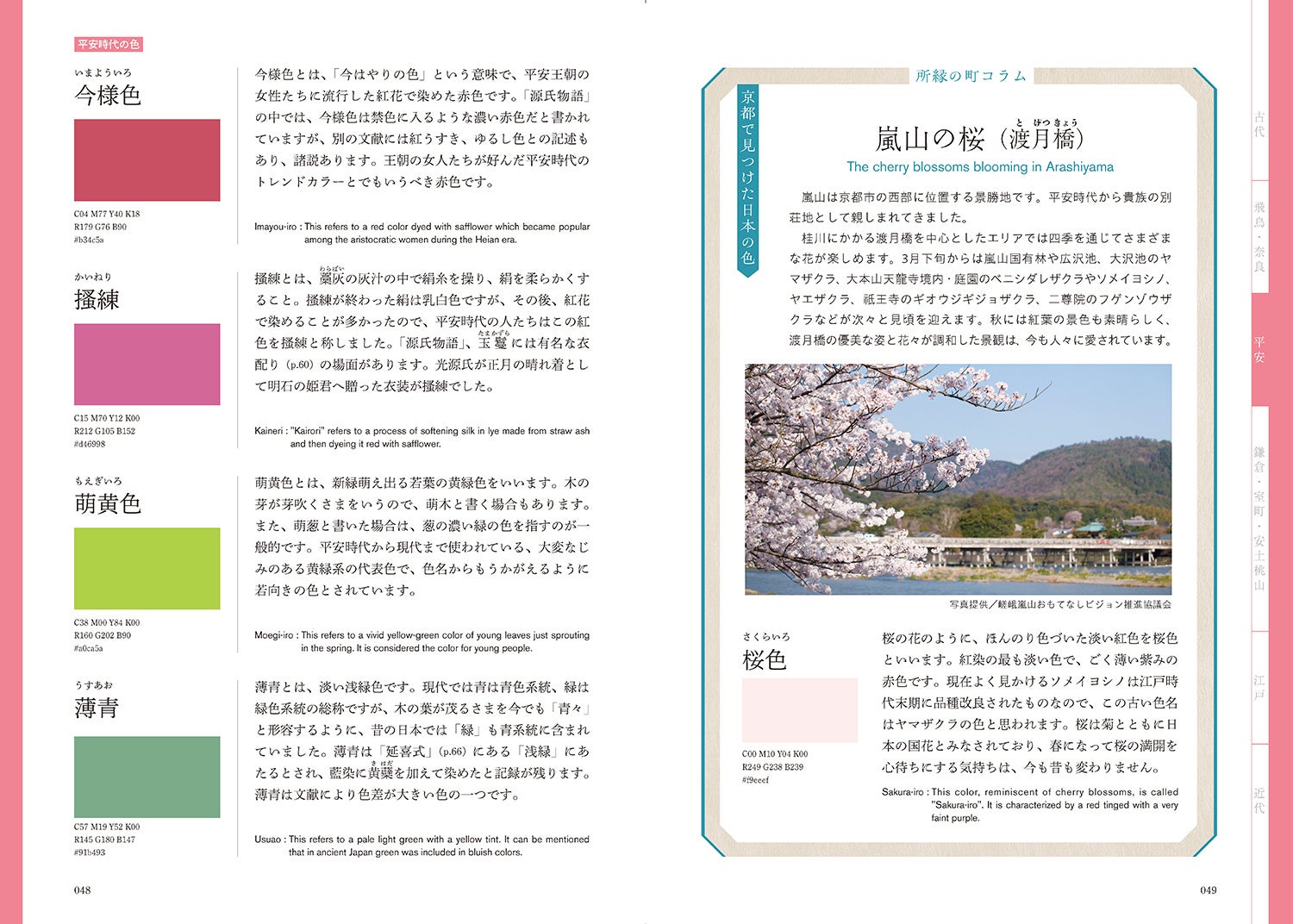 さらに、著者と関わり深い京都と城崎温泉での「所縁(ゆかり)の町で見つけた日本の色」や「時代×現在をつなぐ」などの読み物コラムも充実させました。現代でも伝統色を感じる視点を取り入れることで、読者が日常的に日本の色彩を楽しむきっかけができる、従来の「伝統色の本」とは一味違う構成です。伝統色を通して、日本人の美意識や文化に触れるだけでなく、日常をより豊かにする楽しさを詰め込んだ一冊だといえます。