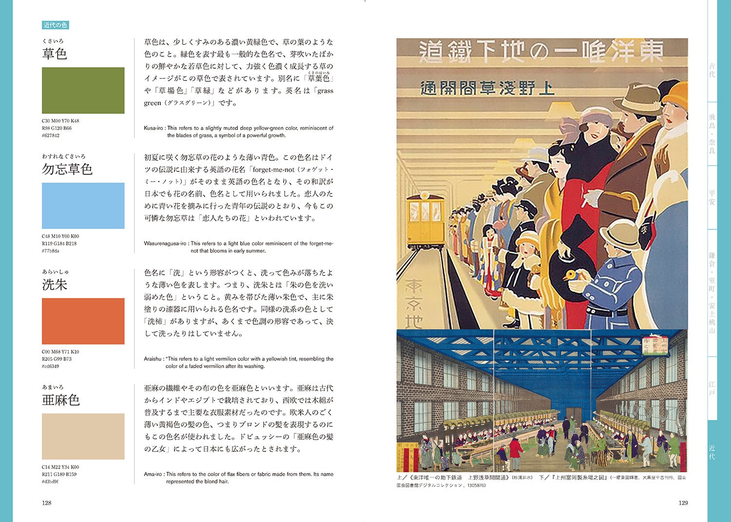 近代化した西洋から、くすみのない合成染料が入り大きく変わった色彩を紹介。筆者が主観で選んだ「おもしろ色名10選」では、知ればますます楽しくなる由来を解説。