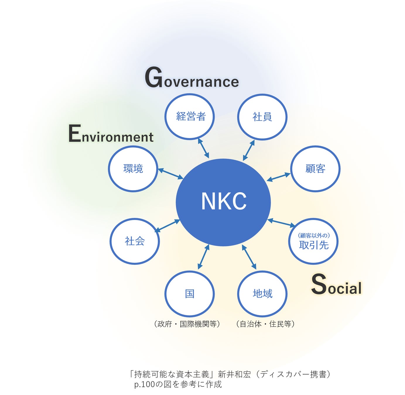 NKCグループは、関わって下さるさまざまなステークホルダーのみなさまとの共存共栄を図る「八方よし」のサステナビリティ経営により、「社会にとってなくてはならない会社」となることを目指します。