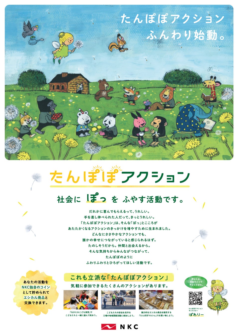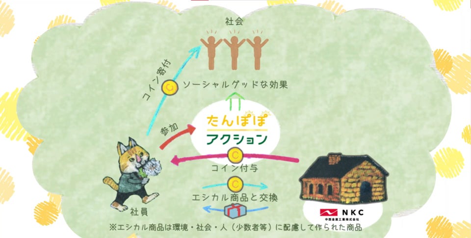 中でもNKCグループで特徴的なのが、Social(社会)領域における取組です。中西奨学会や「福祉カフェ×こども食堂の機能」を持つ「NKCなかにわ」(なかにわカフェ)の設置・運営等、地道な活動を続けて来ました。昨年度より、社員の「本業外」におけるさまざまなソーシャルアクション(社会貢献活動)に対して、社内独自コイン(ポイント)を付与する「たんぽぽアクション」をスタートしました。獲得したコインは、エシカル商品との交換や寄付に充てることができます。