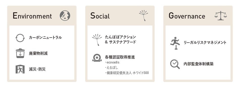 そのための基本方針として、まずはESG(環境(Environment)・社会(Social)・企業統治(Governance))領域における、目には見えにくいさまざまな要素を、できる限り可視化・定量化していくことで、事業戦略の意思決定と融合させるための土壌をつくっていきます。