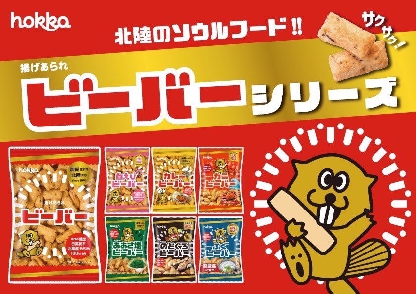 「ビーバー」は、1970年の発売以来、昭和・平成・令和の時代を通じて北陸で長く愛され続けているソウルフードです。「北陸産もち米」に「日高昆布」を練り込み、冷やし固めてから小さく切り、油で揚げて作られます。サクッと軽い食感が特徴のあられは、「徳島鳴門」の焼き塩が絶妙な塩加減で、昆布の旨みと相まって、一度食べたら止まらなくなるおいしさです。