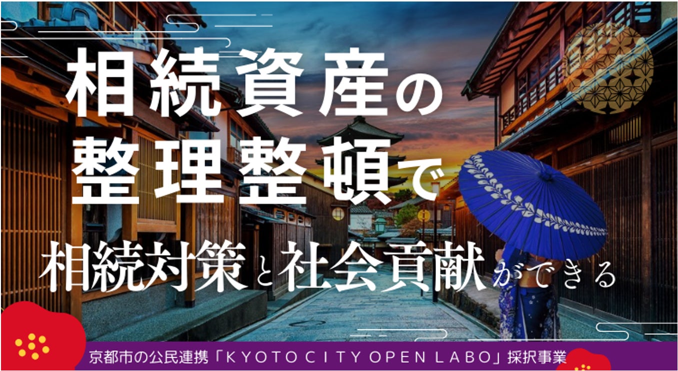 本事業は京都市の公民連携プラットフォーム 「KYOTO CITY OPEN LABO」に採択された事業として、京都市民を対象に、相続資産の整理整頓を支援することで相続対策(終活)を進めながら、遺贈や寄付による社会貢献を実現および支援することを目的に取り組みます。