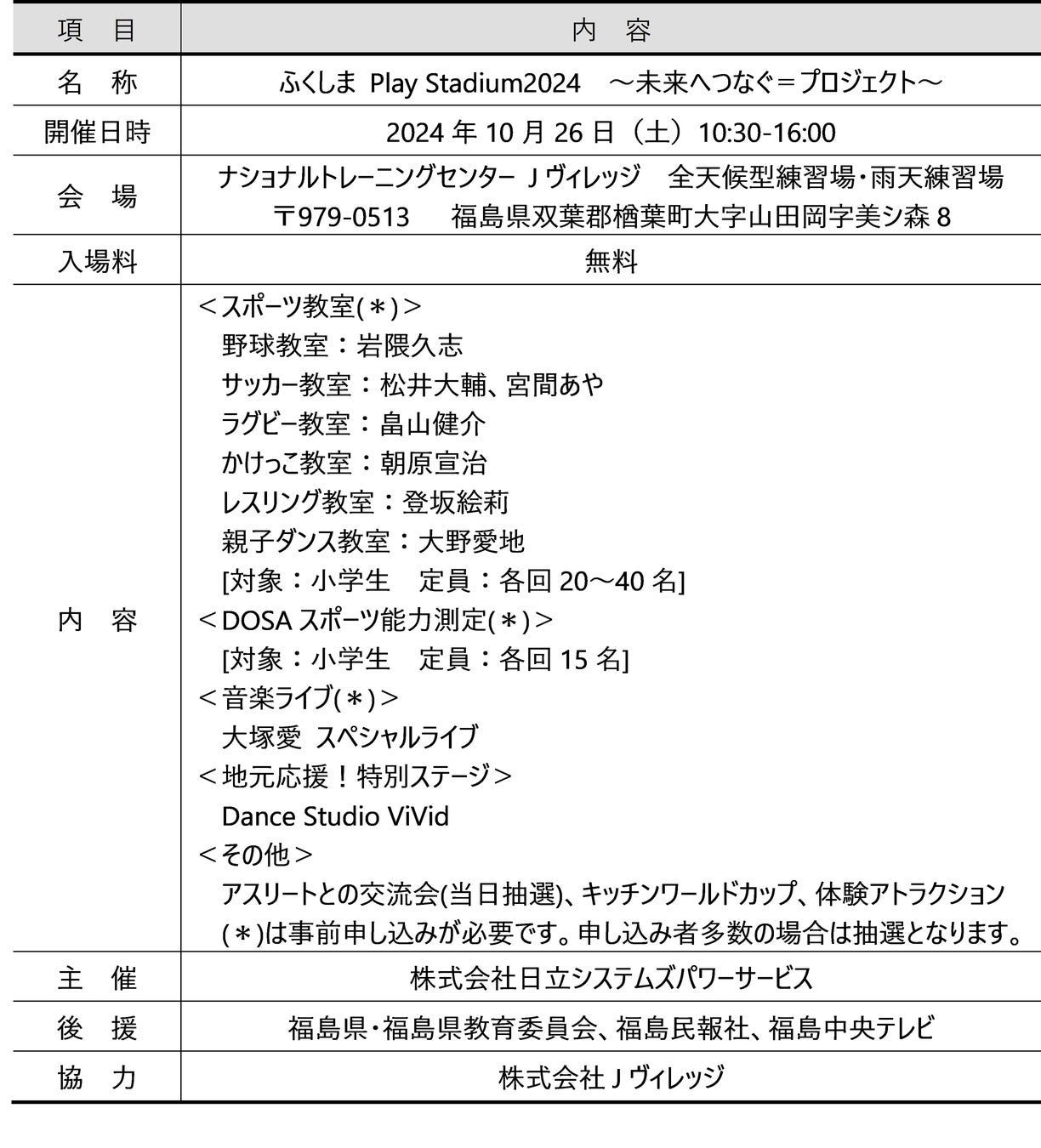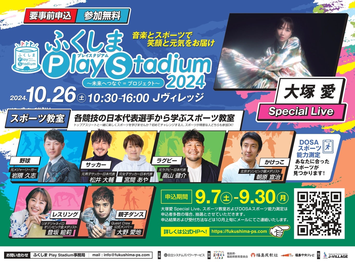 今年も「ふくしま Play Stadium2024 ~未来へつなぐ=プロジェクト~」を開催します。3回目の開催となる今回は、元メジャーリーガーの岩隈久志さん、元サッカー日本代表の松井大輔さん、宮間あやさん、元ラグビー日本代表の畠山健介さん、北京オリンピック陸上男子4x100mリレー銀メダリストの朝原宣治さん、リオデジャネイロオリンピック女子レスリング金メダリストの登坂絵莉さん、Quest Crew公式メンバーの大野愛地さんを講師としたトップアスリートによる小学生向けのスポーツ教室、福島県内のDance Studio ViVidによる地元応援ステージ、そしてイベントの最後にはアーティストの大塚愛さんによるスペシャルライブなど、多彩なプログラムで皆さんのご来場をお待ちしています。トップアスリートの技術やダンスパフォーマンス、そして一流アーティストによる生ライブを実際に体験していただき、訪れた皆さんに笑顔と元気をお届けできるようなイベントにしてまいります。